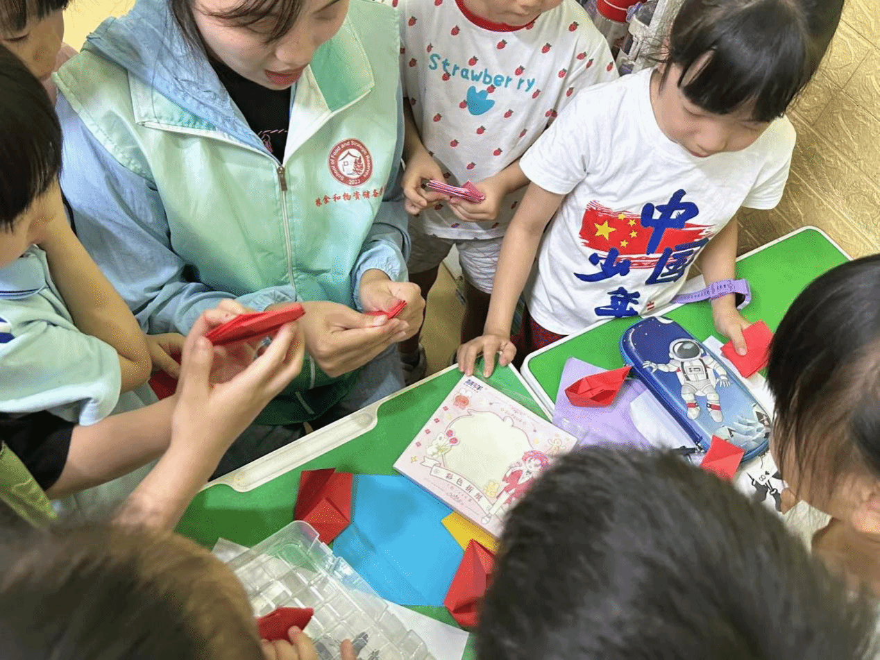 此外,志愿者们还传授了折纸艺术的技巧。通过简单明了的步骤和富有趣味的示范,小朋友们学会了如何折制出形态各异的纸艺作品。折纸活动不仅锻炼了小朋友们的动手能力,激发了他们的创造力,还在轻松愉悦的氛围中加深了他们对节约粮食理念的理解。