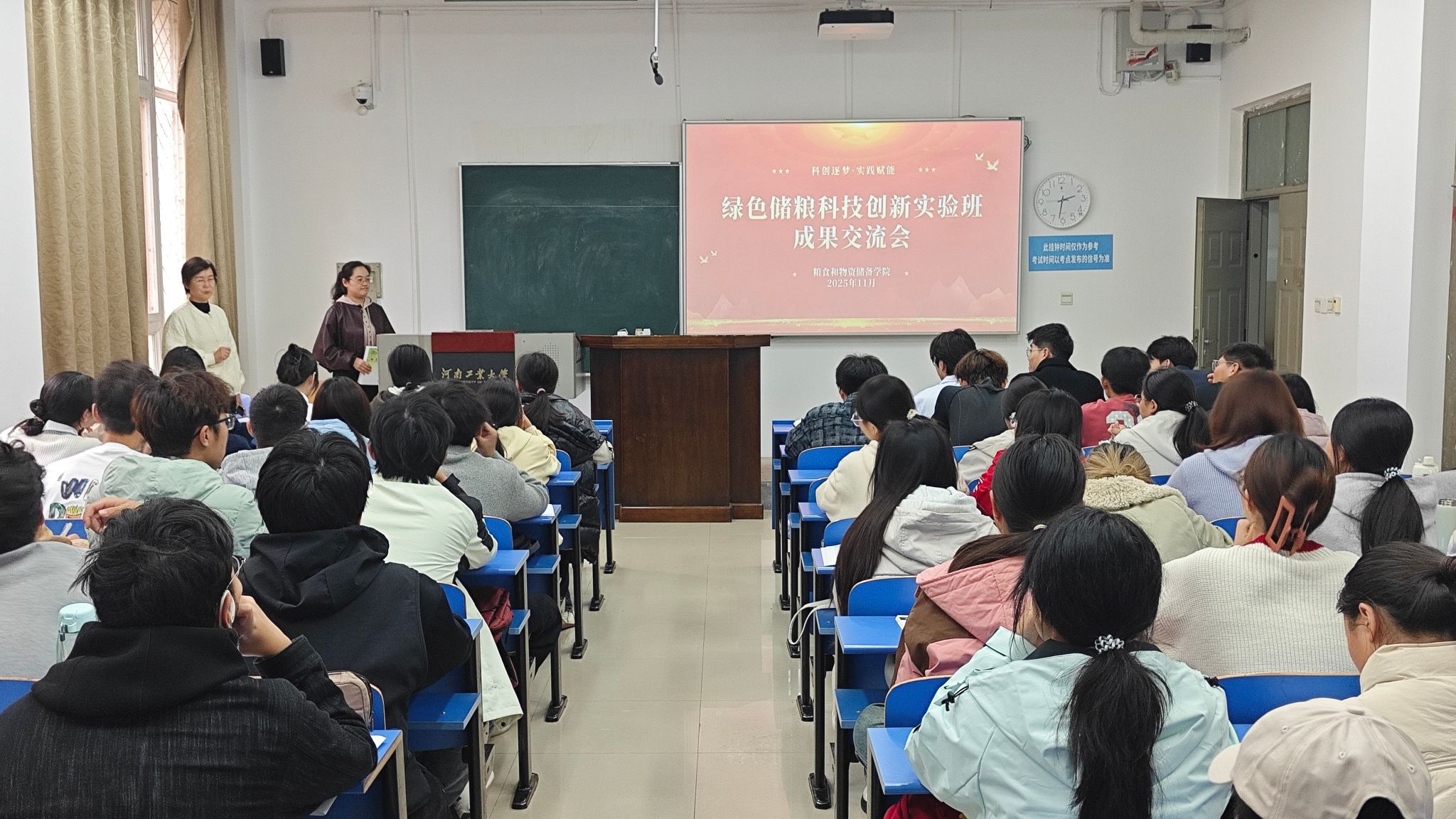 在4117教室举办“创新者说”绿色储粮科技创新实验班成果交流会。学院党委副书记梁艳、团委副书记刘宇畅、第七届全国粮食行业职业技能竞赛获奖师生与2025级全体本科生齐聚一堂,共探储粮科技创新人才的规划之路、成长之道。