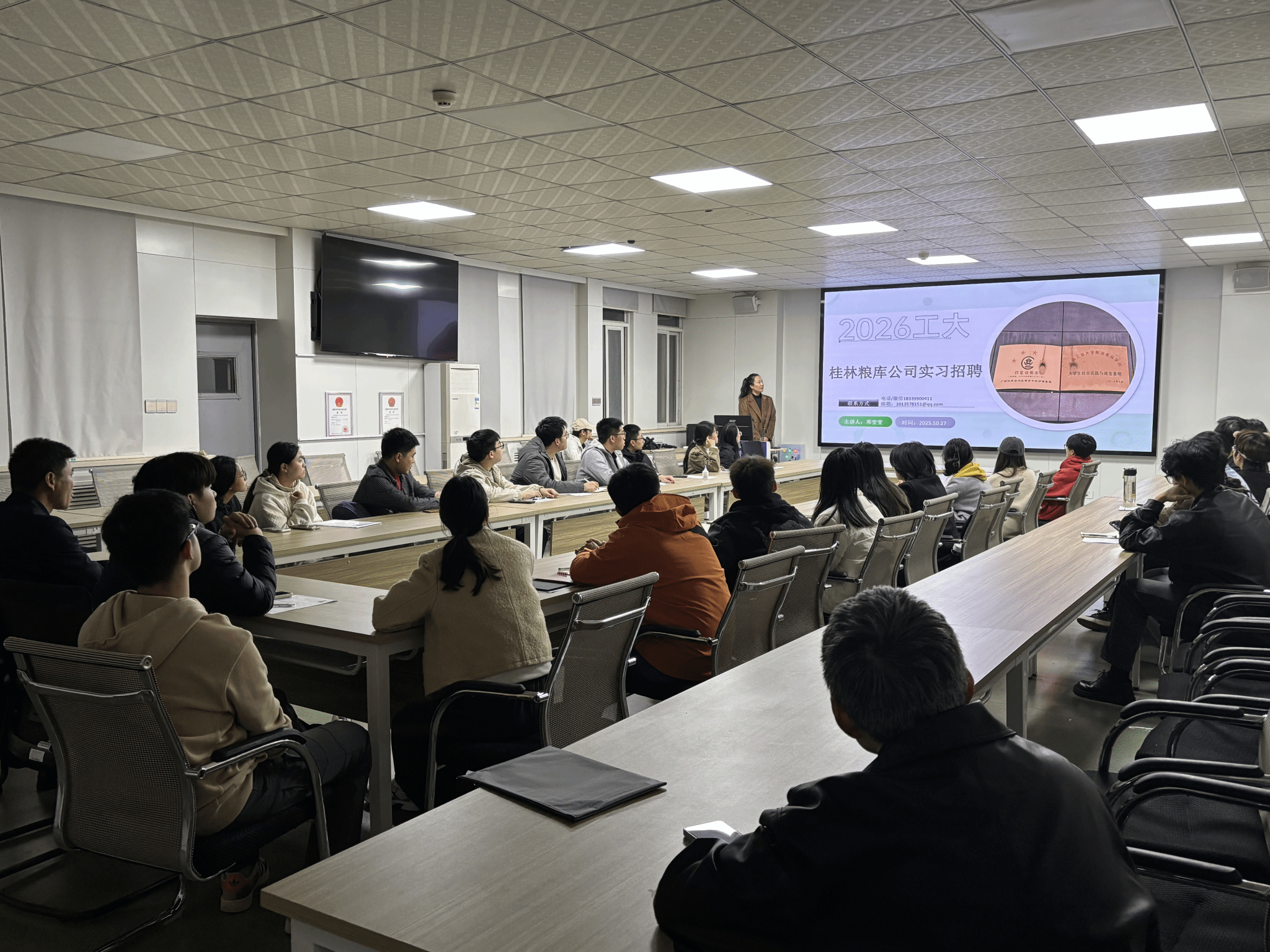 40202捷赛厅顺利举办。桂林粮库公司副总经理黄金宏、桂林粮库公司仓储部副经理邓莹莹和桂林粮库公司办公室副主任李杏参加本次活动,招聘会前与学院党委副书记梁艳、学工办主任马春艳和团委副书记刘宇畅老师进行了深入的交流。此次活动作为学院在职业生涯大赛期间的重要就业活动,吸引了50余名2026届毕业生踊跃参与,为同学们的职业生涯规划提供了宝贵的实践指引。