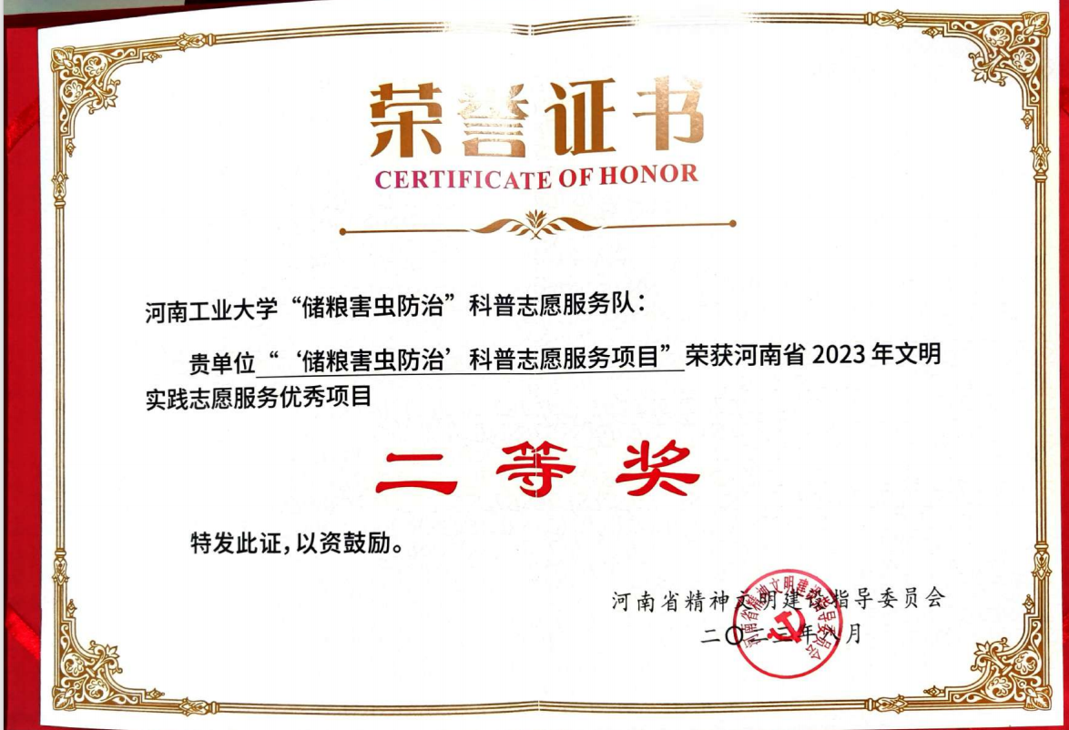 组织的“储粮害虫防治”科普志愿服务队获“河南省2023年文明实践志愿服务项目”二等奖!这是我校首次在该活动中上取得突破。