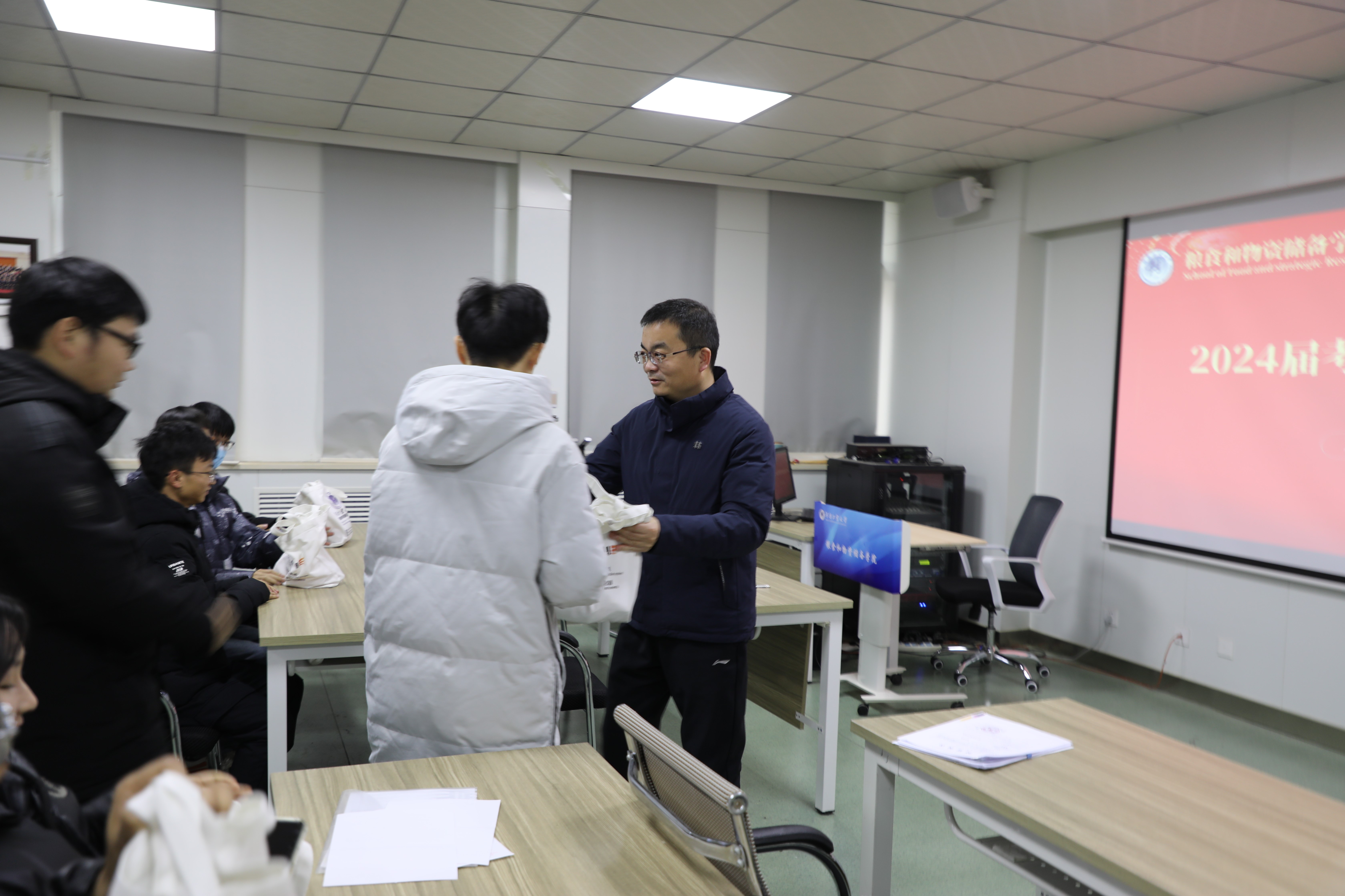 会上,学院领导还为考研学生发放了精心准备的“考研礼包”,既有代表“平安顺遂”的苹果,又有代表“马到成功“”的橙子,还有寓意“巧克难题”的巧克力,考研必备的文具用品,为考研学生送去美好的祝愿。