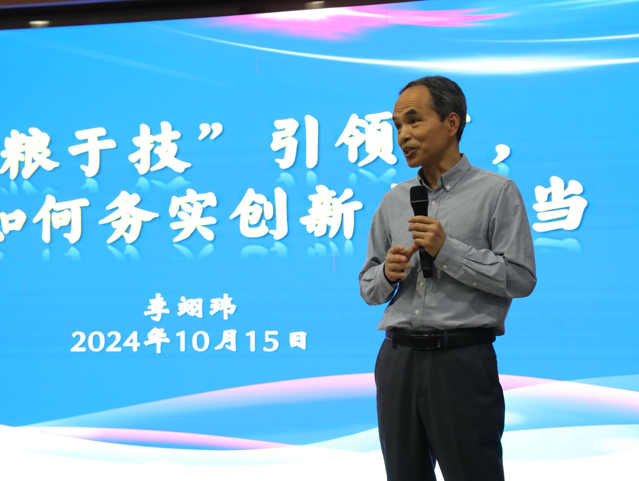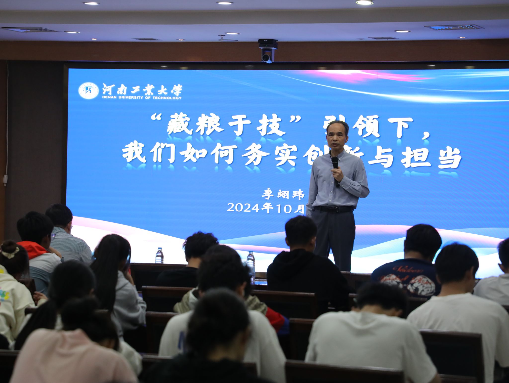 在学术报告中心D102举办第四期“校友大讲堂”活动。粮油储藏专业1979级校友、武汉东昌仓贮技术有限公司董事长李翊玮应邀做了以《“藏粮于技”引领下,我们如何务实创新与担当》为题的报告。武汉东昌仓贮技术有限公司董事长助理李佳蔓和部分高管,学院党委副书记梁艳,二级教授王殿轩,本科生辅导员以及2023和2024级本科生共同出席报告会。报告会梁艳主持。
