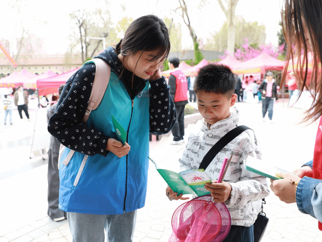 (图为志愿者为小朋友细心讲解结核防治知识)