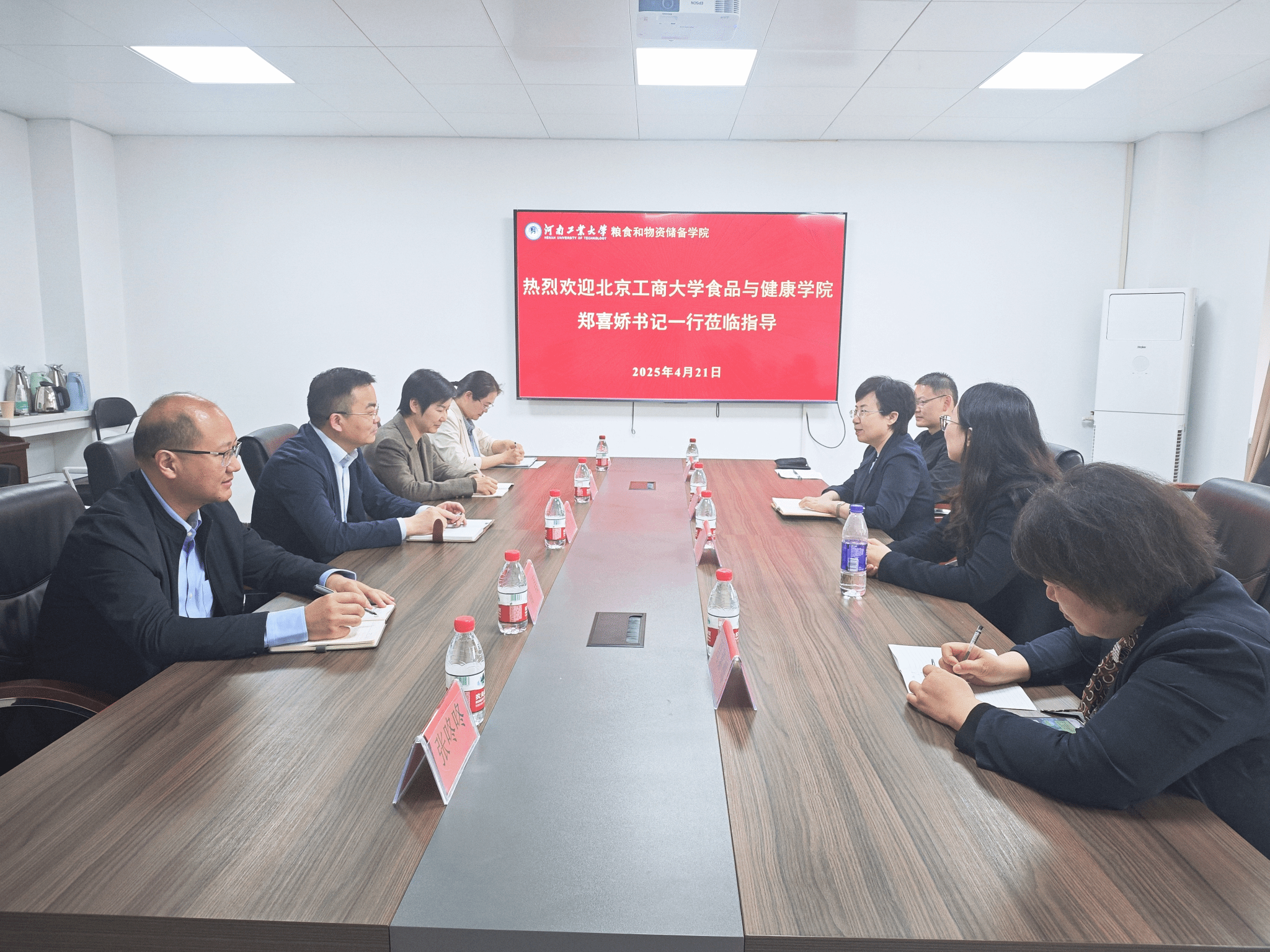 代辉亚对郑喜娇一行来访表示热烈欢迎,并介绍了学院的发展历程、办学特色、人才培养、社会服务以及未来在粮食及食品领域的发展策略等。阎磊介绍了学院的科研、学科建设情况,梁艳介绍了本科生、研究生等情况。郑喜娇介绍了北京工商大学食品与健康学院的发展沿革、师资、学科等情况,刘慧琳介绍了学院的平台建设、特色方向以及硕博士研究生招生等情况。双方一致表示,要进一步加强在食品领域内的学科建设、人才培养、科学研究、社会服务等的合作与交流,为进一步丰富食品学科内涵、保持各自特色方向提供新的推动力。