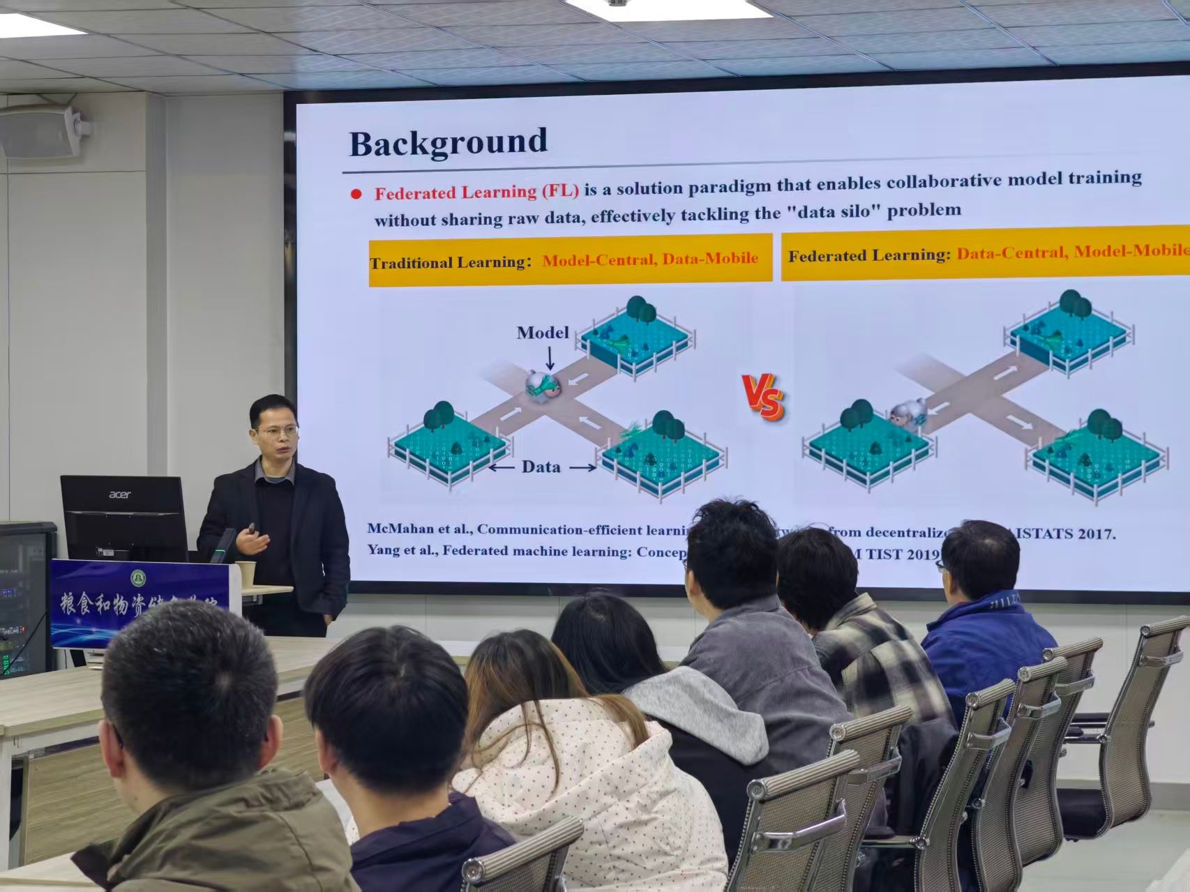 报告中,曾锦山教授以联邦大语言模型为核心,系统阐释了其概念内涵、发展脉络与前沿应用,并结合粮食储藏领域的行业特性,针对性地设计了技术落地场景。他指出,联邦学习作为一种新型人工智能技术,能够在不共享原始数据的前提下实现多客户端协同训练,为破解大数据时代粮食行业普遍存在的“数据孤岛”难题提供了全新解题思路。