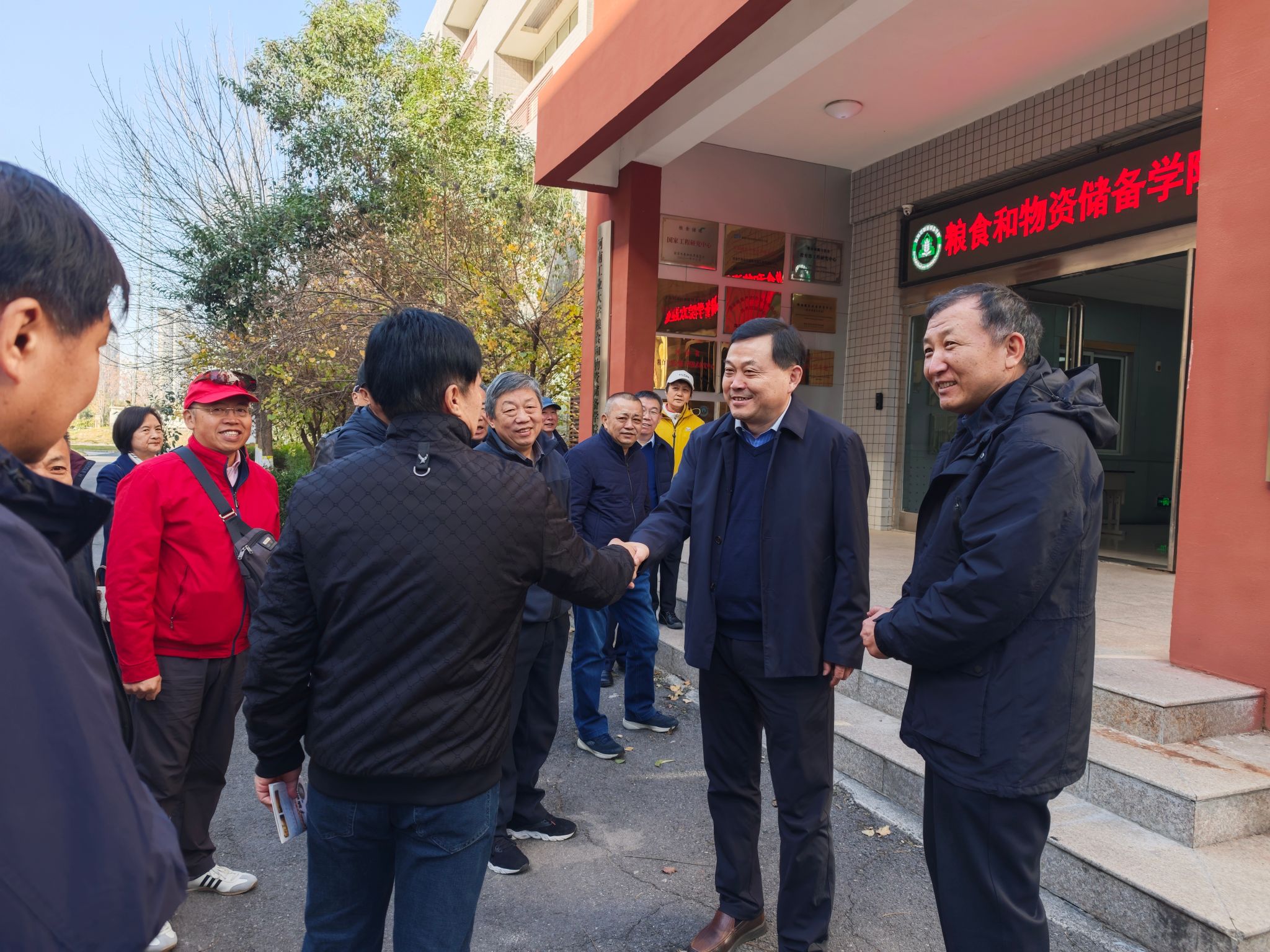 崇实楼前暖意融融,学院党委副书记梁艳与王殿轩老师早早等候,热情迎接储藏系813班近20位校友重返母校。时光荏苒四十载,王殿轩老师仍能精准叫出每位校友的名字,一句句亲切呼唤,既是青春记忆的唤醒,更是同窗情谊的延续与升华。